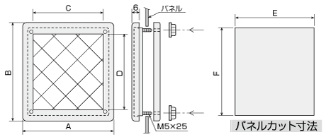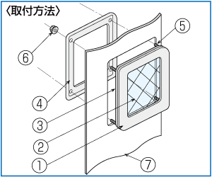 ![]() パネルにカット寸法の穴を開け、窓枠本体をはめ込みます。 次に、押え枠を本体スタッドボルトに取り付け、ナットにて締め付けます。